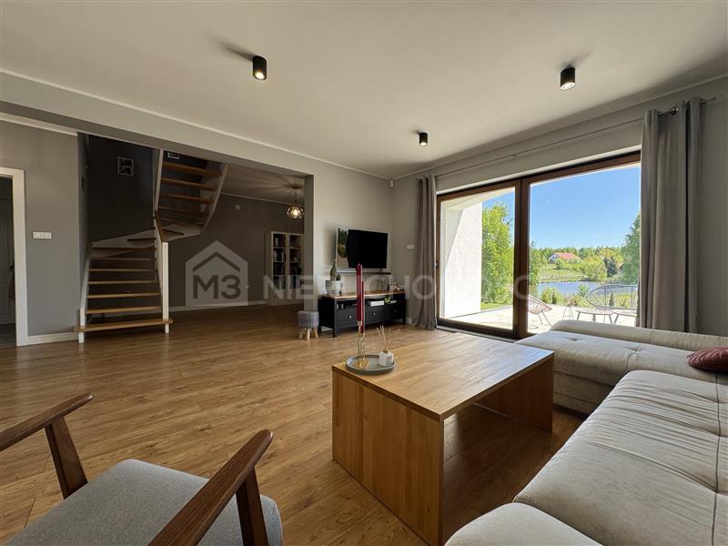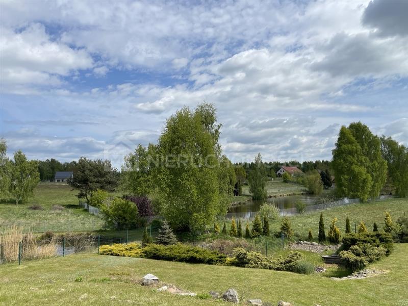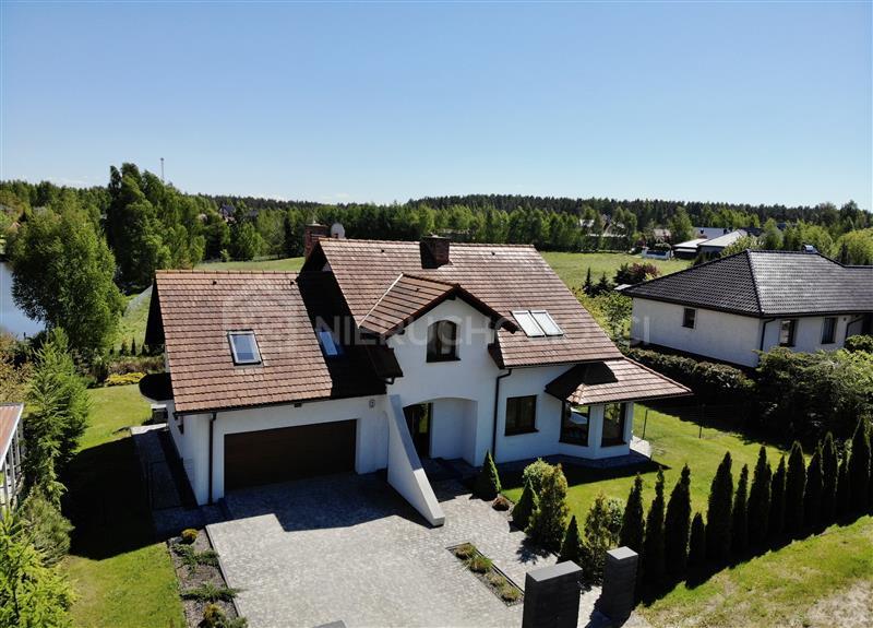 Przedstawiany dom otoczony pięknym, zagospodarowanym ogrodem, którego część stanowi naturalne oczko wodne.