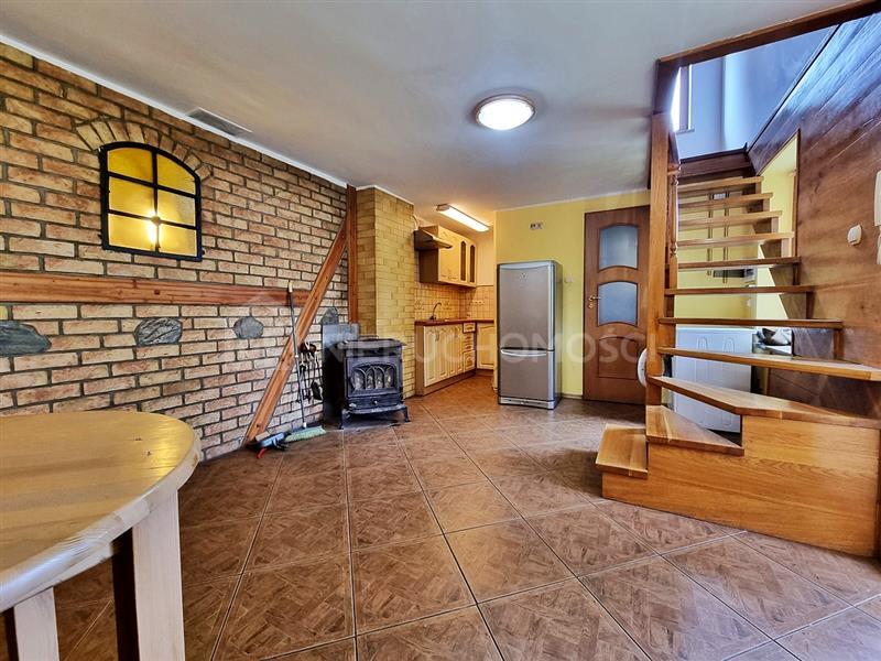 Budynek gospodarczy o powierzchni użytkowej ok. 36 m2 został zaadaptowany na pomieszczenia mieszkalne, na które składają się: na parterze (ok. 23 m2) salon z aneksem kuchennym i łazienką oraz na poddaszu (ok. 13 m2) sypialnia z wyjściem na balkon. Część mieszkalna ogrzewana kominkiem wolnostojącym. Do budynku z jednej strony przylega murowany garaż jednostanowiskowy o powierzchni ok. 21 m2. Z drugiej strony budynku przylega drewniana wiata służąca jako pomieszczenie gospodarcze stanowiące skład opału i miejsce na przechowywanie sprzętów ogrodowych.