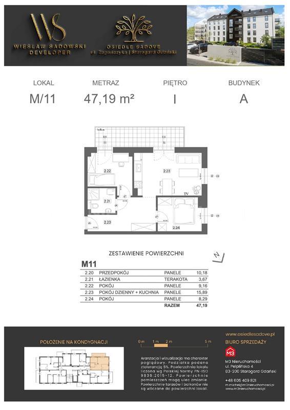 Przedmiotem oferty jest słoneczne mieszkanie 3 pokojowe z widokiem na park o projektowanej pow. 47,19 m2 zlokalizowane na I piętrze budynku. Mieszkanie składa się z: przedpokoju o pow. 10,18 m2, salonu z aneksem kuchennym o pow. 15,89 m2 z wyjściem na balkon, dwóch sypialni o pow. 9,16 m2 , 8,29 m2 oraz łazienki o pow. 3,67 m2.