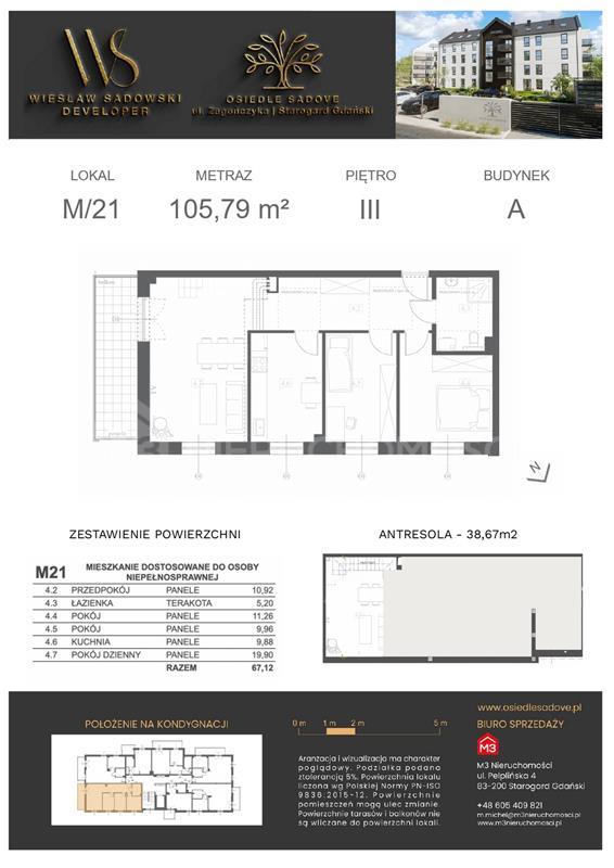 Mieszkanie składa się z: przedpokoju o pow. 10,92 m2, salonu o pow. 19,90 m2 z wyjściem na balkon, kuchni o pow. 9,88 m2 , 2 sypialni (11,26 m2 , 9,96 m2 ,9,96 m2 ), łazienki o pow. 5,20 m2 . Na poziomie antresoli o pow. 38,67 m2 jest przestrzeń do aranżacji na dodatkowy pokój, gabinet, garderobę.