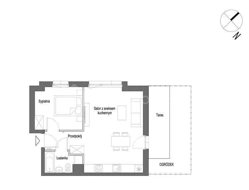 Mieszkanie składa się z salonu z aneksem kuchennym i wyjściem na niewielki taras z ogródkiem, oddzielnej sypialni, łazienki oraz przedpokoju. Do lokalu przynależy także komórka lokatorska o powierzchni 3,18 m2.