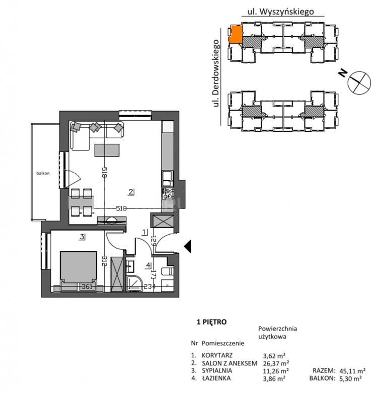 Na sprzedaż 2 pokojowe mieszkanie z balkonem o powierzchni użytkowej 45,11 m2 położone na I piętrze w bloku mieszkalnym przy ul. Wyszyńskiego w Starogardzie Gdańskim – Inwestycja Apartamenty Derdowskiego.