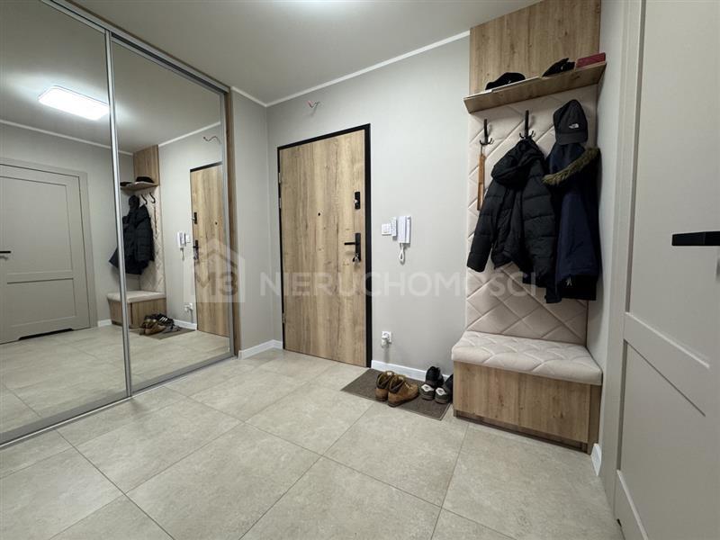 Przestronny przedpokój z praktyczną wnęką zamykaną drzwiami przesuwnymi z lustrem – za nimi znajduje się funkcjonalna garderoba (więcej niż zwykła szafa, wygodne miejsce do przechowywania).